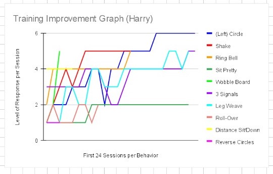 Some of these behaviors do demonstrate a linear path of improvement – notably (Left) Circle and Shake; Harry overall showed same or improved understanding with each session. But notice in particular the 3 Signals and Leg Weave behaviors; they’ve been up and down all over the place – still demonstrating an overall incline over the course of 20+ training sessions, but a significant amount of needing to step back and work at simpler levels or returning to using food as a lure to build motivation and persistence.
