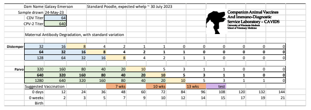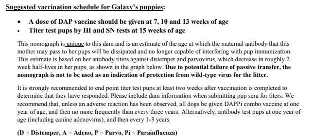 Here is Galaxy’s nomograph report, which was determined by running a titer test on her blood. The lab analyzed what protection levels she personally has against the two core diseases we want to be sure her puppies are protected from – parvo and distemper – and then used her specific titer values to each disease to come up with a customized time-line for when her puppies (the V litter) are best served for receiving their puppy vaccination/s.