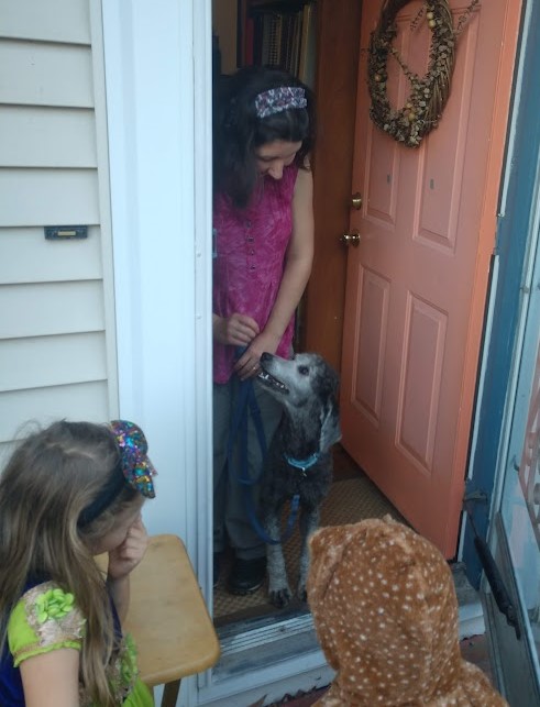 Have your hubby put on a hat and carry a box across the room, and when it’s clear that doesn’t bother your dog he can add a gruff voice while he continues to pet or toss a toy. Have your daughter drape a scarf or sheet over her face and dance around with a broom, perhaps ‘sweeping’ treats or a toy gently towards your dog. Stage a mini sword-fight with excited interactions between two people.
