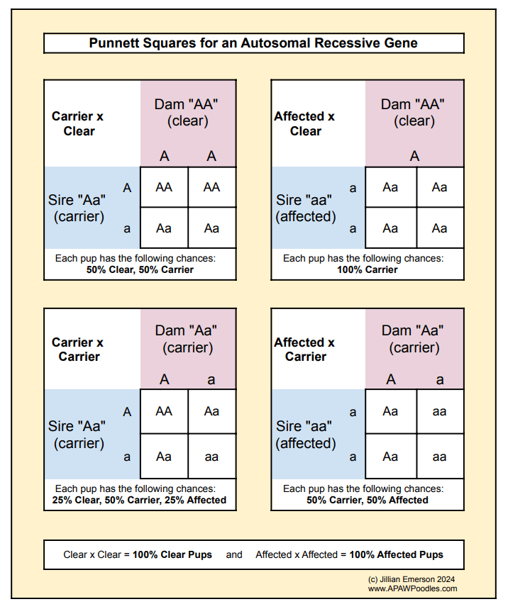 There are some genetic diseases which have different modes of inheritance whereby a single copy can still produce affected puppies – vWD (von Willebrand’s Disease) is a common example of this; as an autosomal dominant gene with incomplete penetrance, a single copy of the gene can still result in a dog who develops the disease but to a milder degree than if they had inherited two copies. CDDY (Chondrodystrophy) and it’s consideration as a ‘risk factor’ towards the potential development of IVDD (Intervertebral Disc Disease) is another example; many breeds have this gene spread heavily throughout the population, with a much smaller percentage of the population actually developing any related health trouble. Research by the UC Davis Vet Genetics Lab indicate that 57-61%+ of Toy and Miniature Poodles have 1 or 2 copies of the CDDY gene yet a far fewer percentage of small Poodles are ever affected by IVDD so the presence of the gene is somewhat considered “normal”, though with desire to breed away from when possible. The gene has not been found in many Standards and most are never tested because we don’t see much IVDD in the variety, but it becomes an important factor to consider for breeders who have lines that combine the size varieties – what if the gene has more impact on dogs of a larger size?