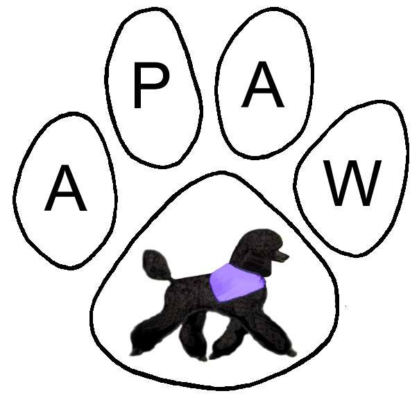 The original APAW logo of the vested Poodle inside a paw print was designed for APAW back when we were a non-profit service dog training organization. Besides being a nice overall logo, our biggest need was a design suitable as patches for our service dog capes. I love that logo and it means so much to me!