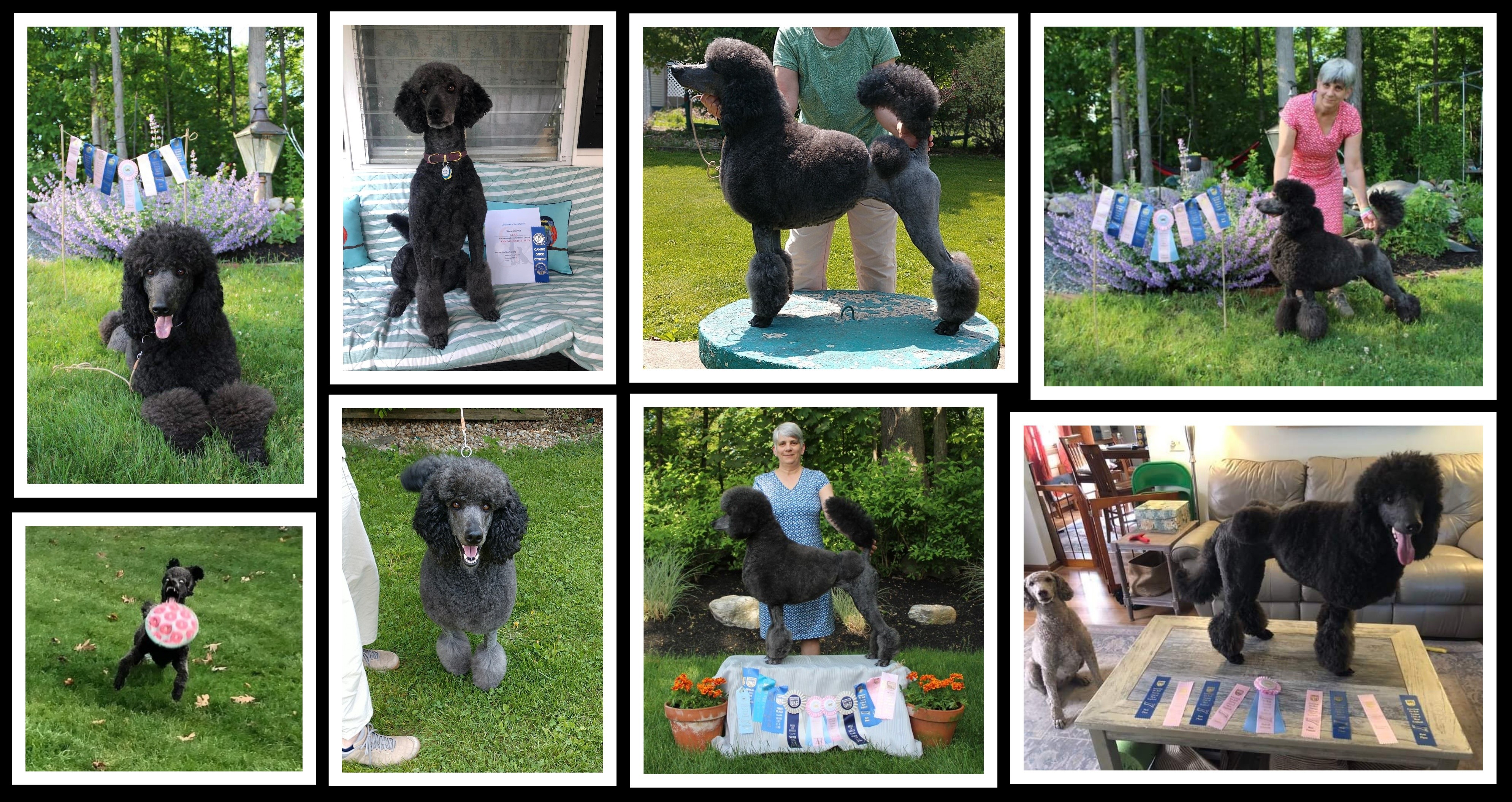 Lyric is an athletic, companionable girl with stunning good lucks and a sturdy build. Not quite as intense as her brother Locket, or as socially-gregarious as her dam Denali, Lyric is a nice middle ground dog who is easy in the home, though she has high prey drive. She is titled in conformation and temperament, has legs towards her novice precision coursing title and is training for rally and tricks. She loves to play fetch and catch frisbees. Lyric’s various accomplishments and health testing qualified her for the Versatility Certificate from Versatility in Poodles.