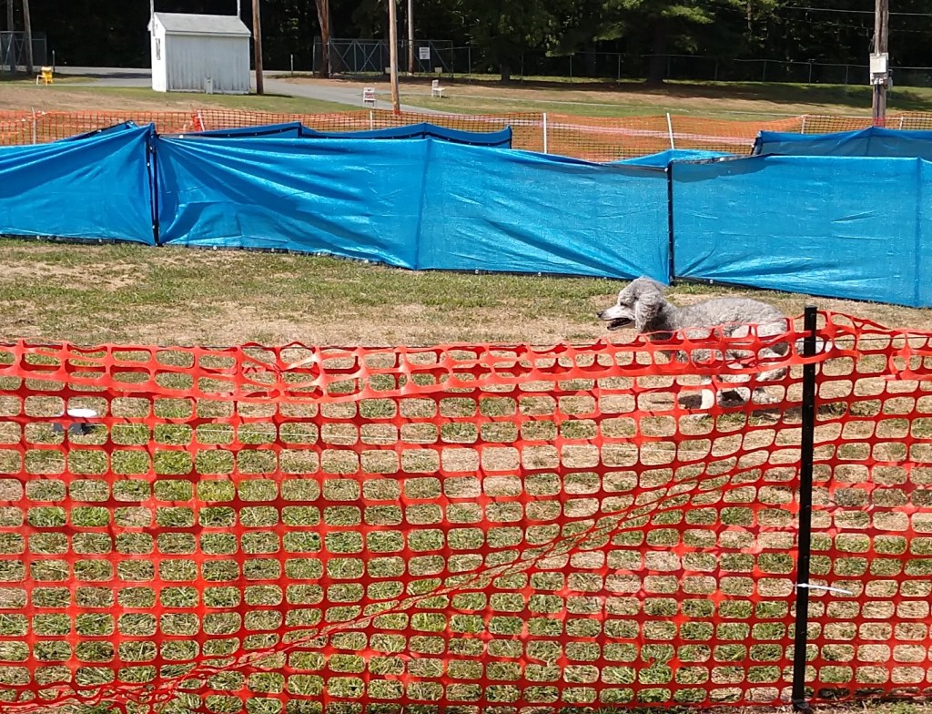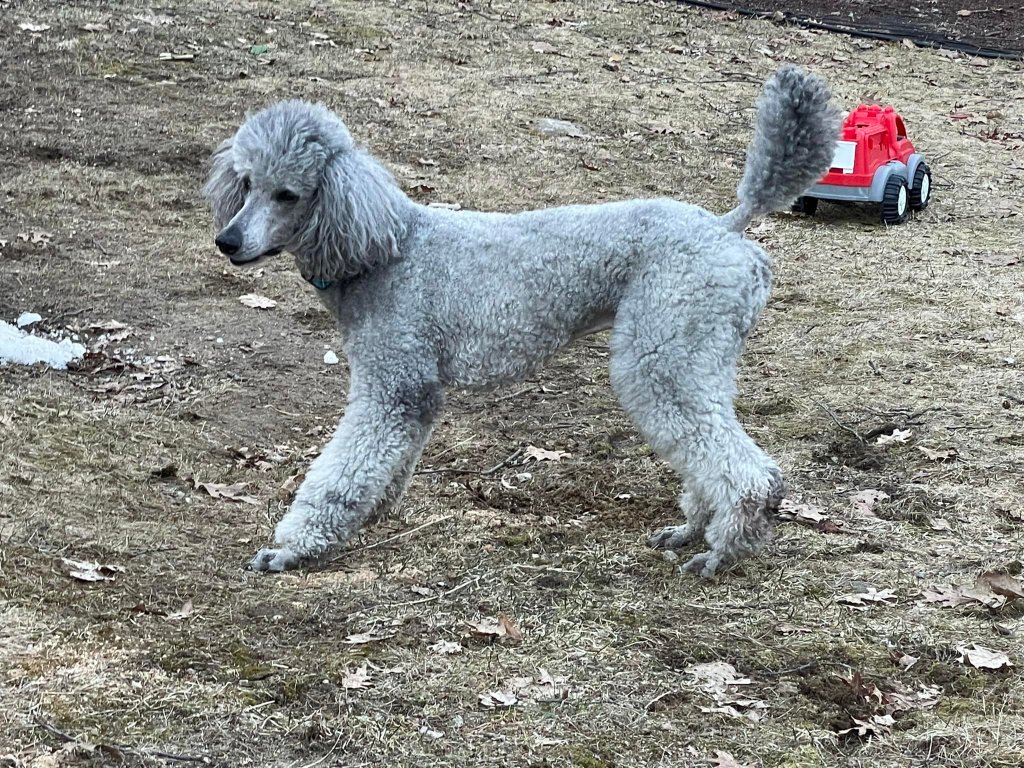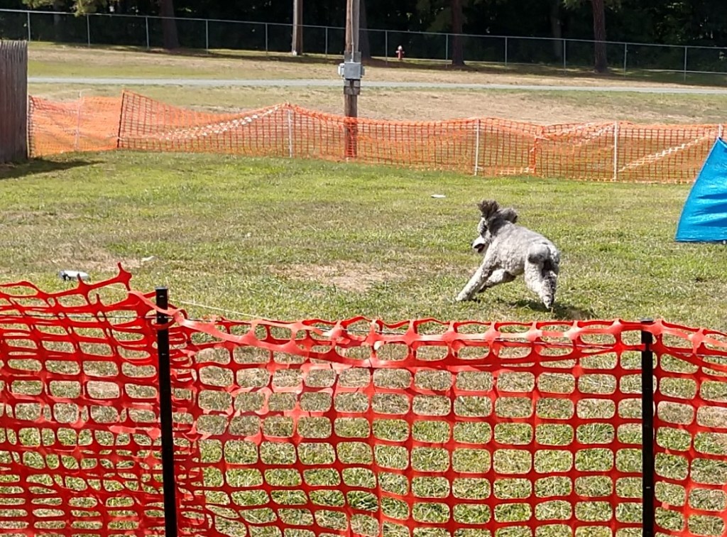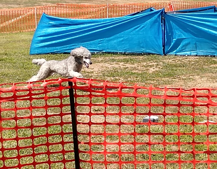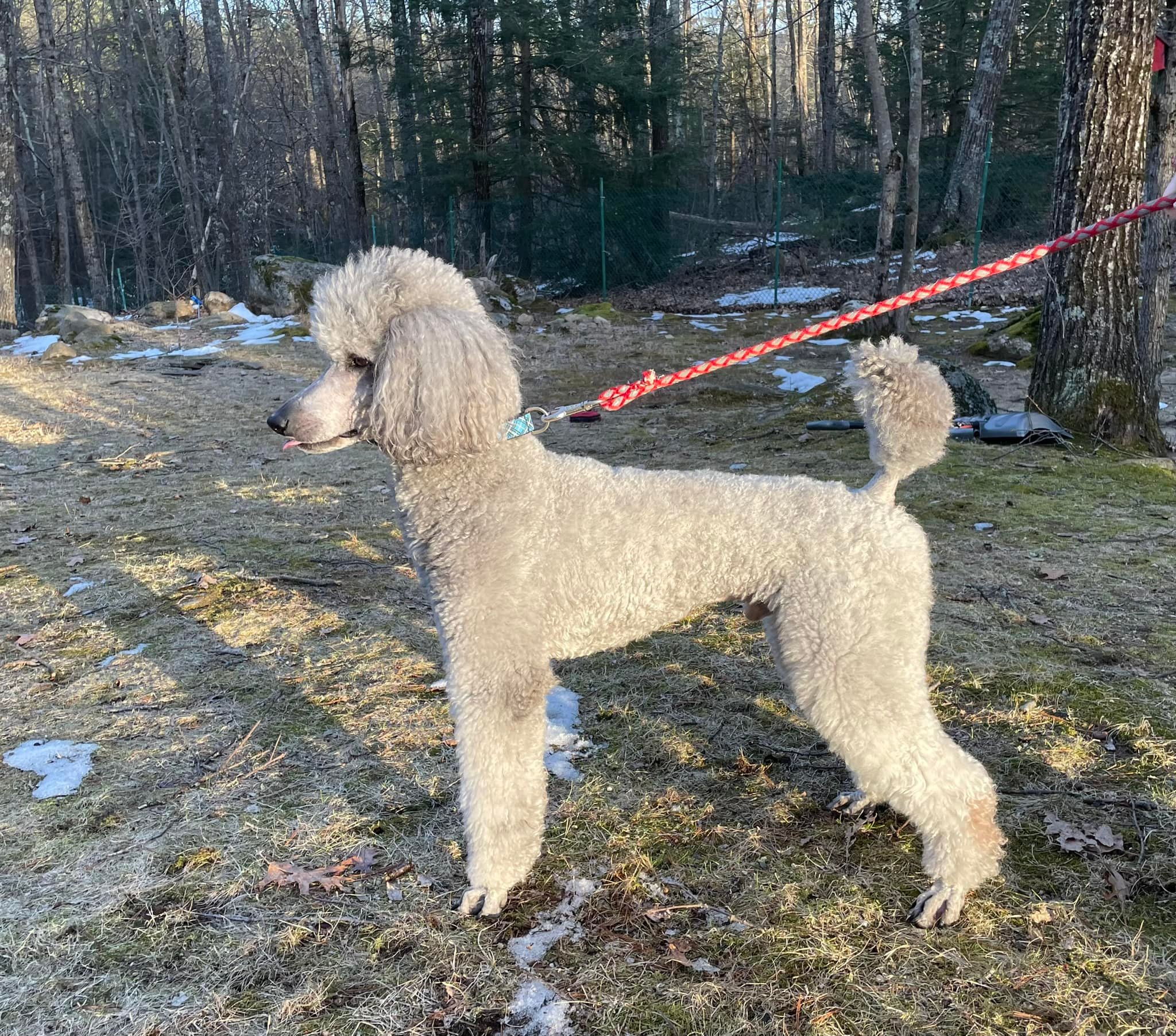 Thunder is a confident, outgoing boy with drive and an off-switch. He is from DoeValley Poodle lines, bred by Debonair Poodles and was a puppy-back to DoeValley. He spent a few days living here and was easy and well-behaved from the moment he arrived, blended in with the other dogs and the kids, and crated quietly as needed.